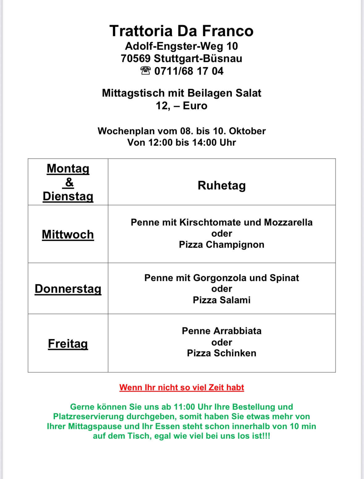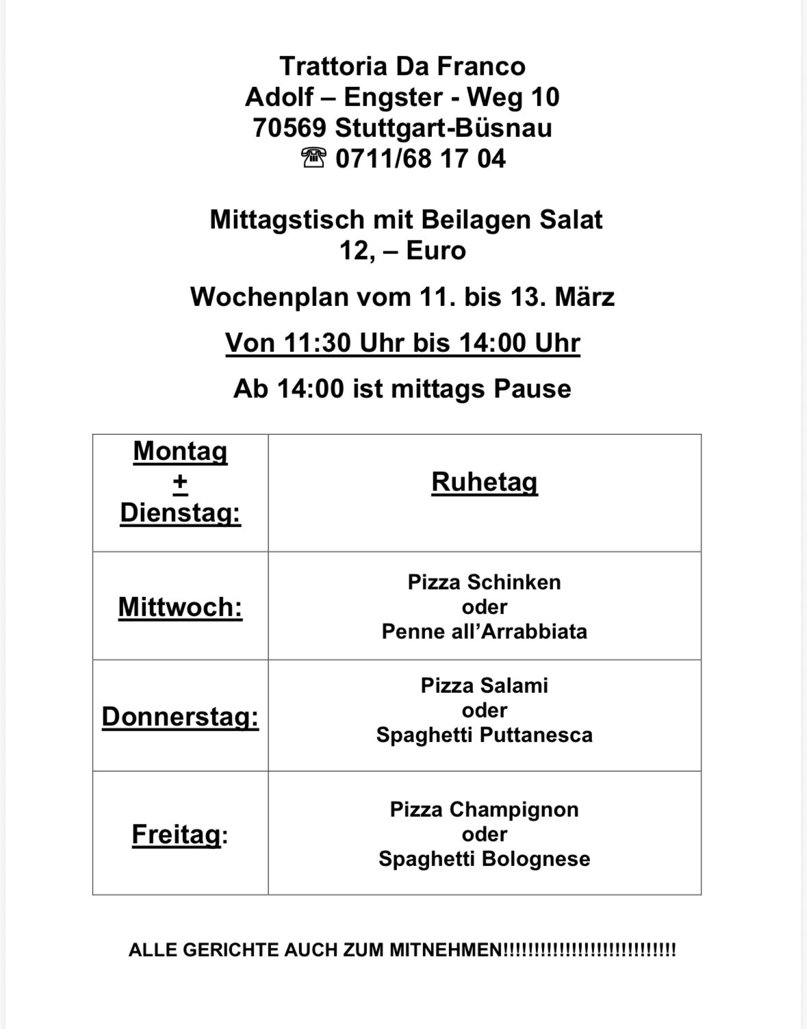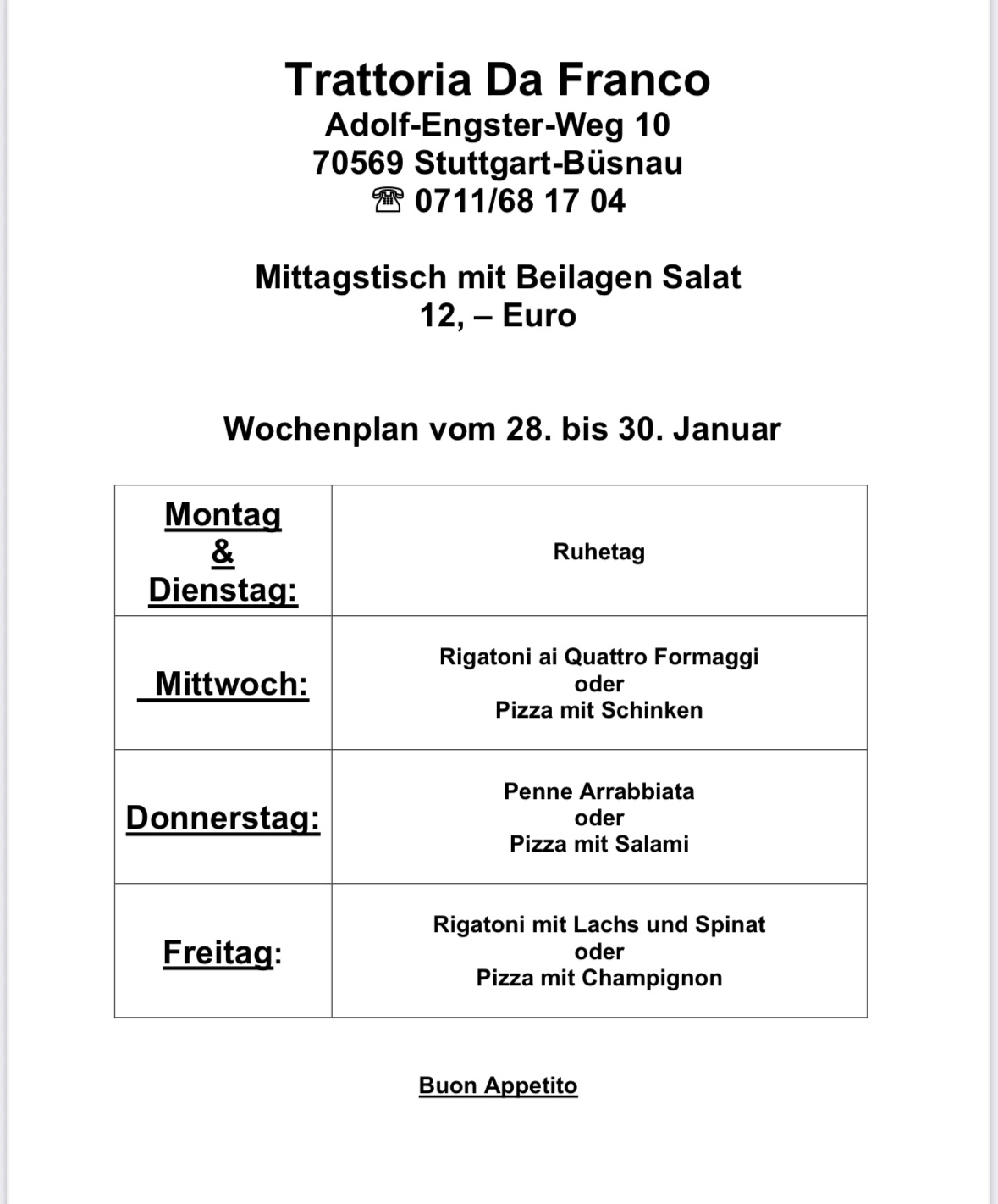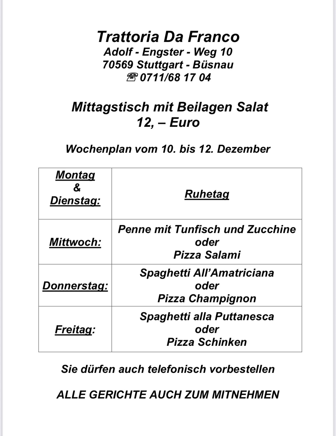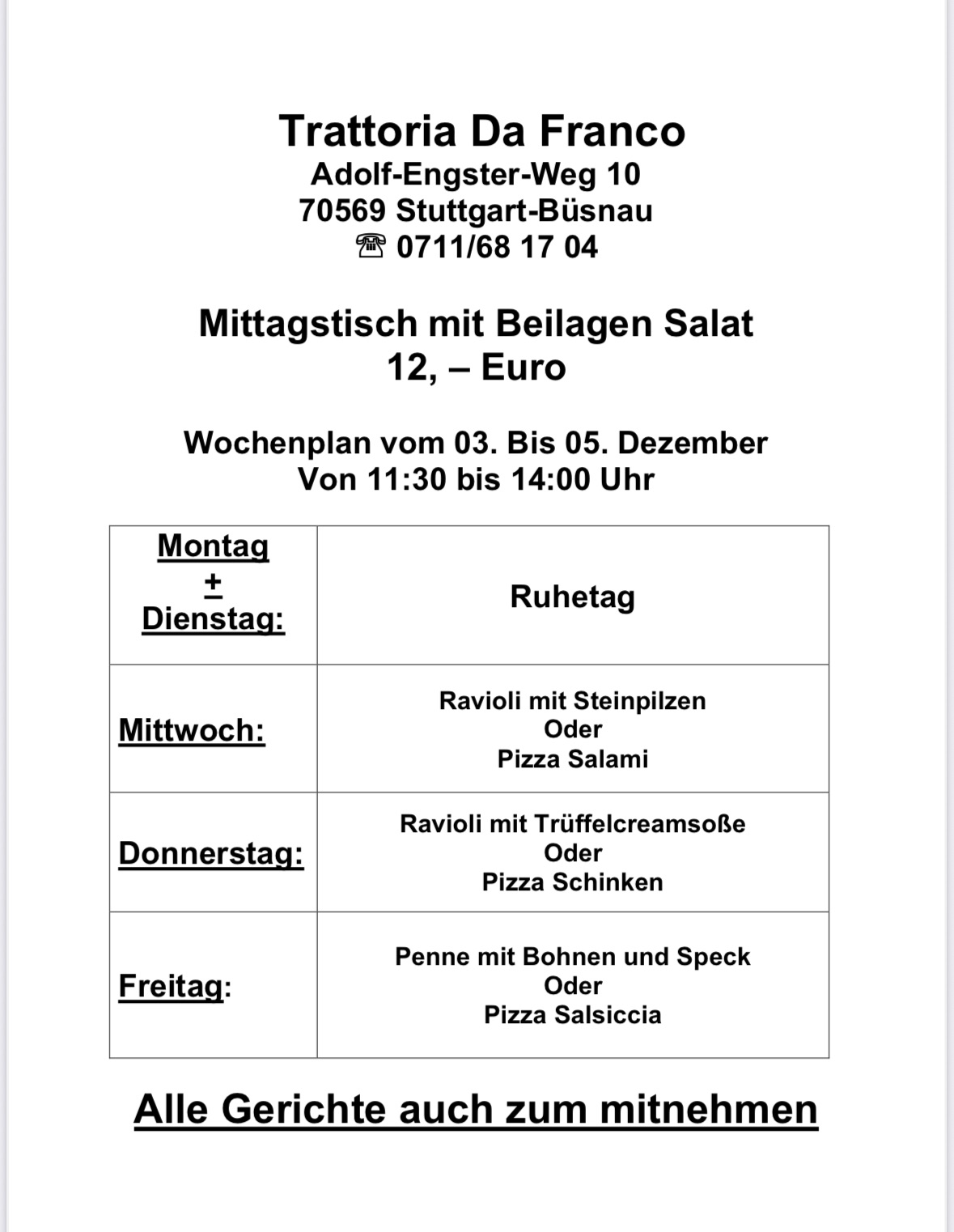Mittagstisch Mittagstisch Trattoria Da Franco Adolf-Engster-Weg 10 70569 Stuttgart-Büsnau ’ 0711/68 17 04